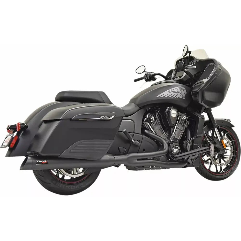 Die Bassani Road Rage 2-into-1 Anlage für Indian kommt mit abgestuften Endrohren und einem Megaphon-Schalldämpfer in schwarz. Der perfekte Auspuff für den Fahrer, der Power und Sound will.