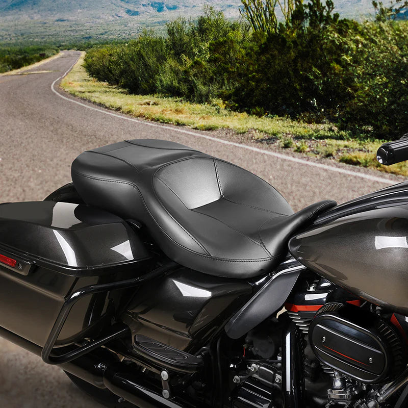 Dieser 2-Up-Sitz touring versetzt den Fahrer leicht nach hinten und sorgt so für eine entspanntere Sitzposition. Er eignet sich besonders gut für größere Fahrer. Der breite Fahrerbereich bietet hervorragenden Halt für die Hüften und den unteren Rücken, während der Beifahrerbereich gleichmäßig konturiert ist und auch auf längeren Fahrten stabilen Komfort bietet.