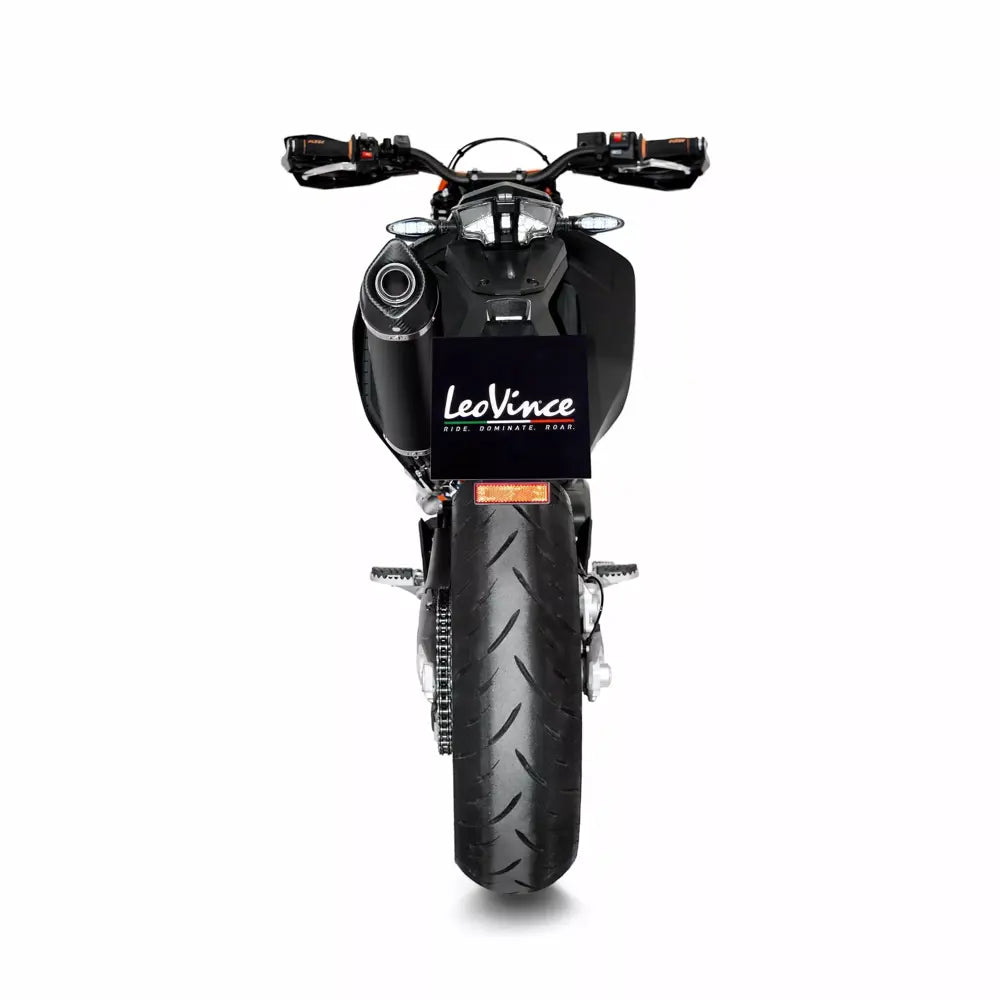 Give your KTM a bold, blacked-out look with the LeoVince Nero Exhaust System. Built from durable AISI 304 stainless steel and coated in heat-resistant matte black ceramic paint, this exhaust delivers both style and performance. With a lightweight carbon fiber end cap and a laser-etched LeoVince logo, the Nero is designed to turn heads.