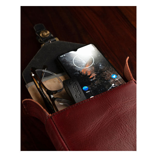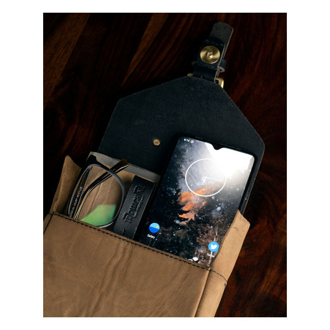 Die Trip Machine Tankrucksack wurde entwickelt, um Ihre wichtigsten Utensilien wie Schlüssel, Handschuhe, Geldbörse oder ein Bandana zu transportieren. Er wird mit sechs starken Magneten sicher an Ihrem Tank befestigt und kann an Ihrem Gürtel eingehängt werden, wenn Sie nicht auf dem Motorrad sitzen. Er ist aus hochwertigem Leder handgefertigt, langlebig und wird mit der Zeit immer besser, da er mit der Zeit eine einzigartige Patina entwickelt.
